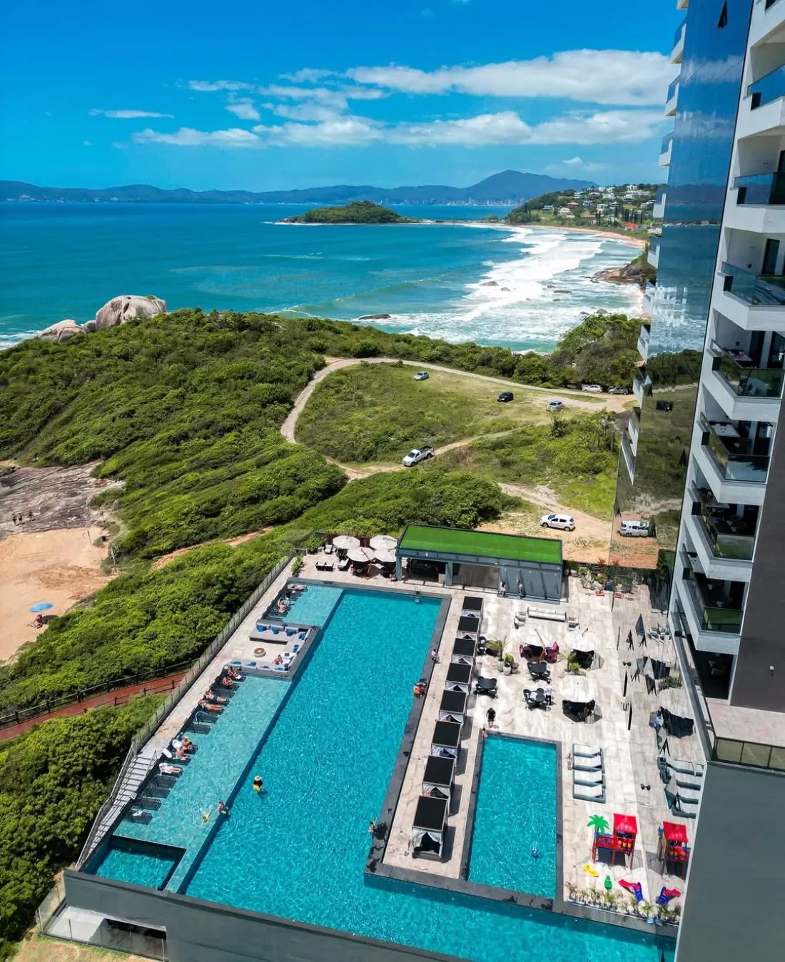 Um dos grandes marcos da obra é a piscina com mais de 700m³ de água, entregue pela Artzzen com excelência em cada detalhe. A estrutura conta com borda infinita, sistema completo de filtragem e iluminação subaquática, além de um design que integra a paisagem natural do mar com o ambiente de lazer do hotel.